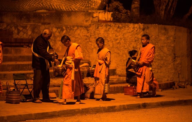 Täglich, pünktlich zur Morgendämmerung findet in ganz Laos das «alm giving» statt. Die buddhistischen Mönche marschieren barfuss und schweigend durch die noch dunklen Gassen in der Nachbarschaft ihrer Pagoden. Am Strassenrand sitzen Einheimische jeden Alters und legen in die Schalen der Mönchen Bällchen geformt aus…